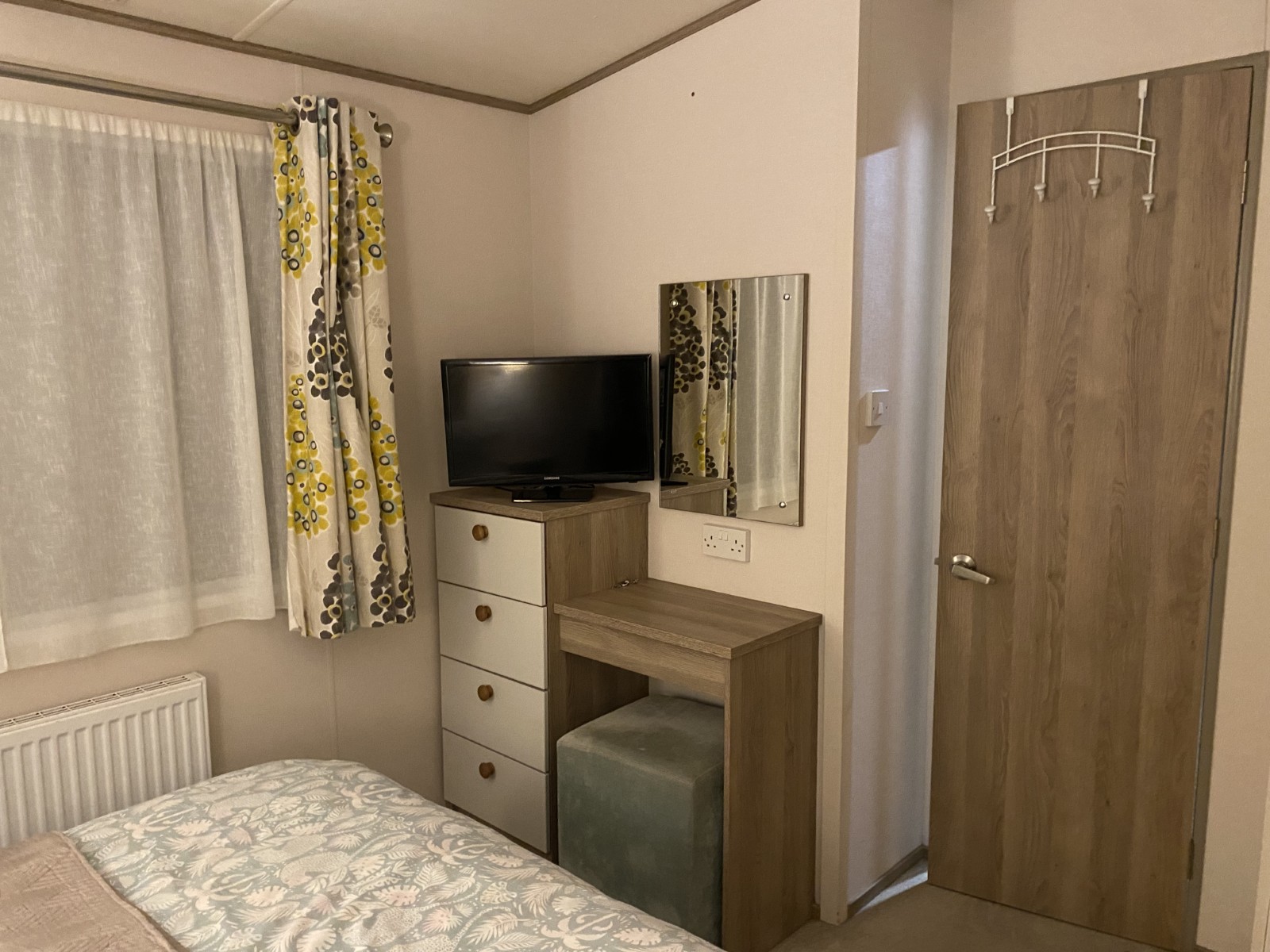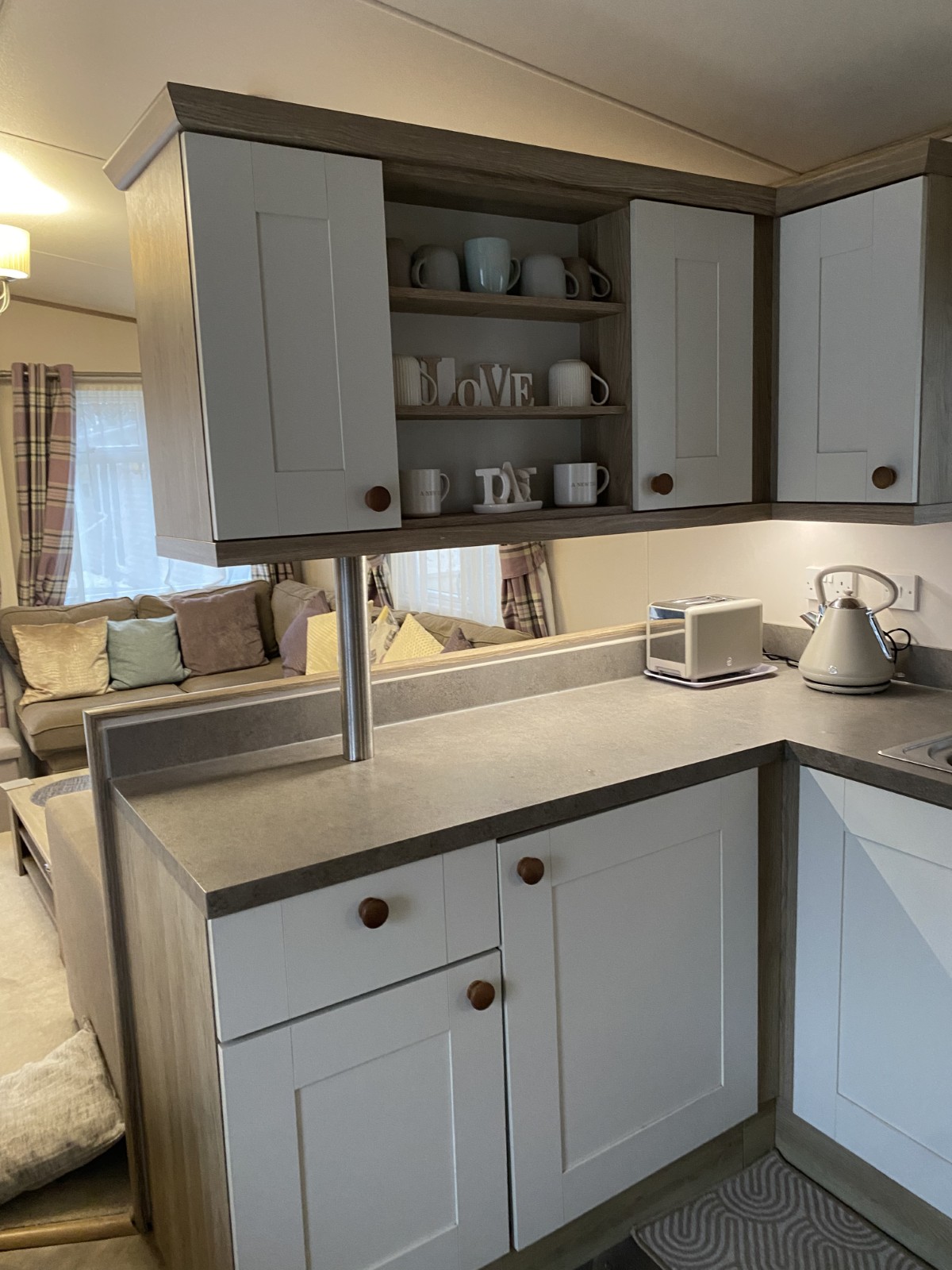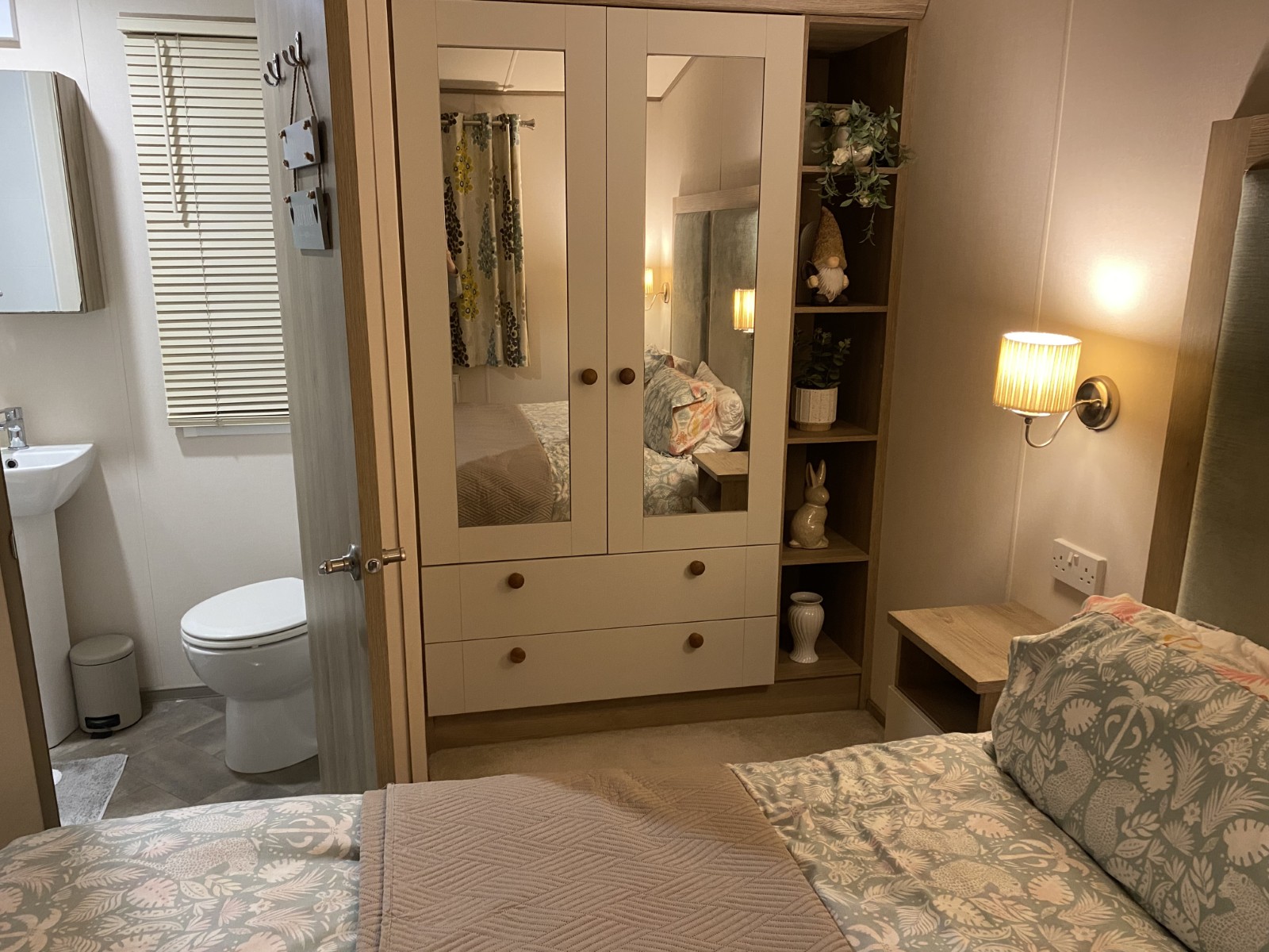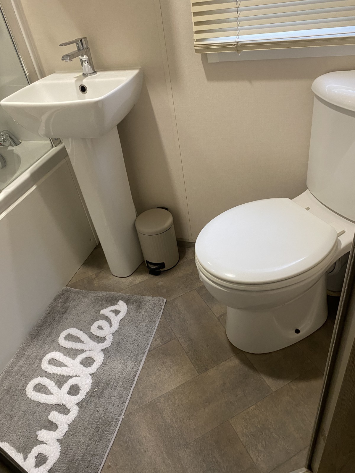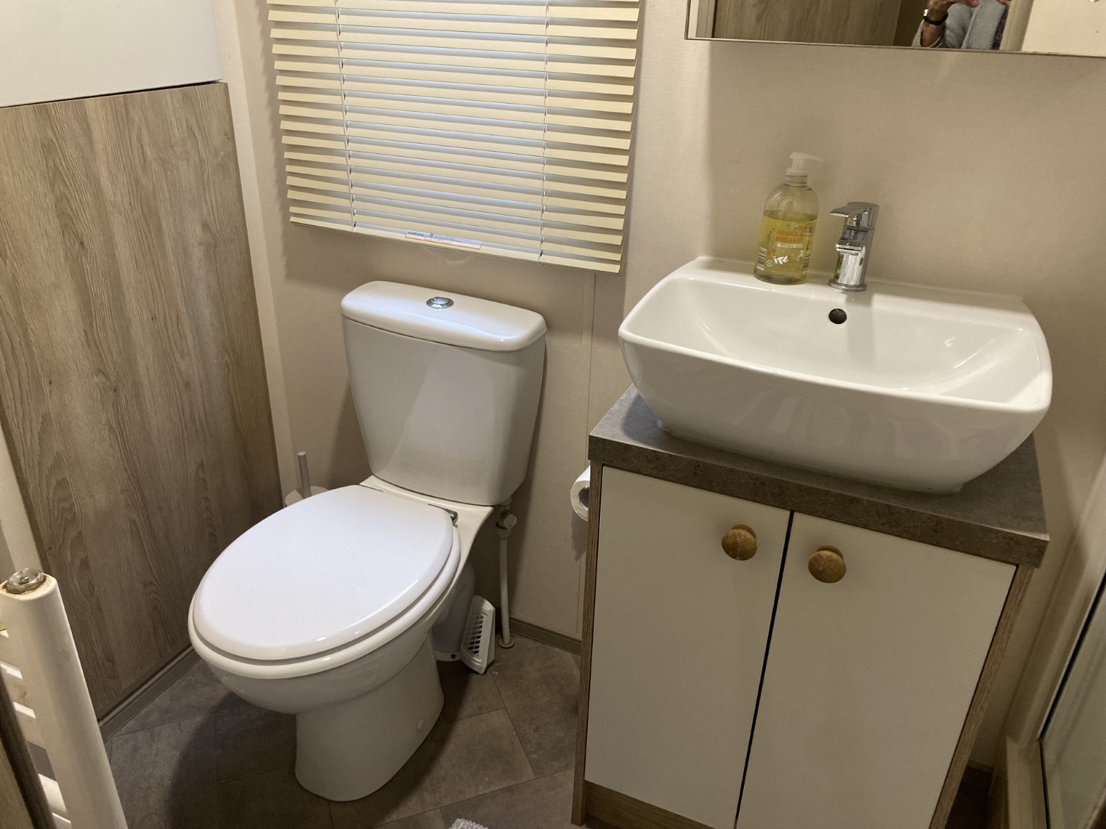 The cupboard next to the toilet houses the combi gas boiler which delivers hot water and heats the caravan when required. Toilet rolls, hand wash and toiletries are supplied in both bathrooms.