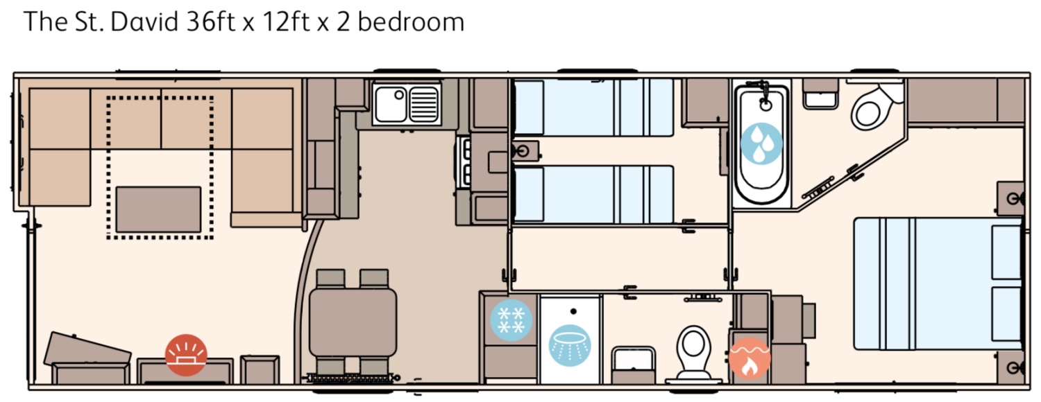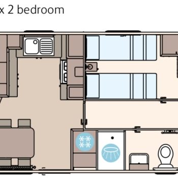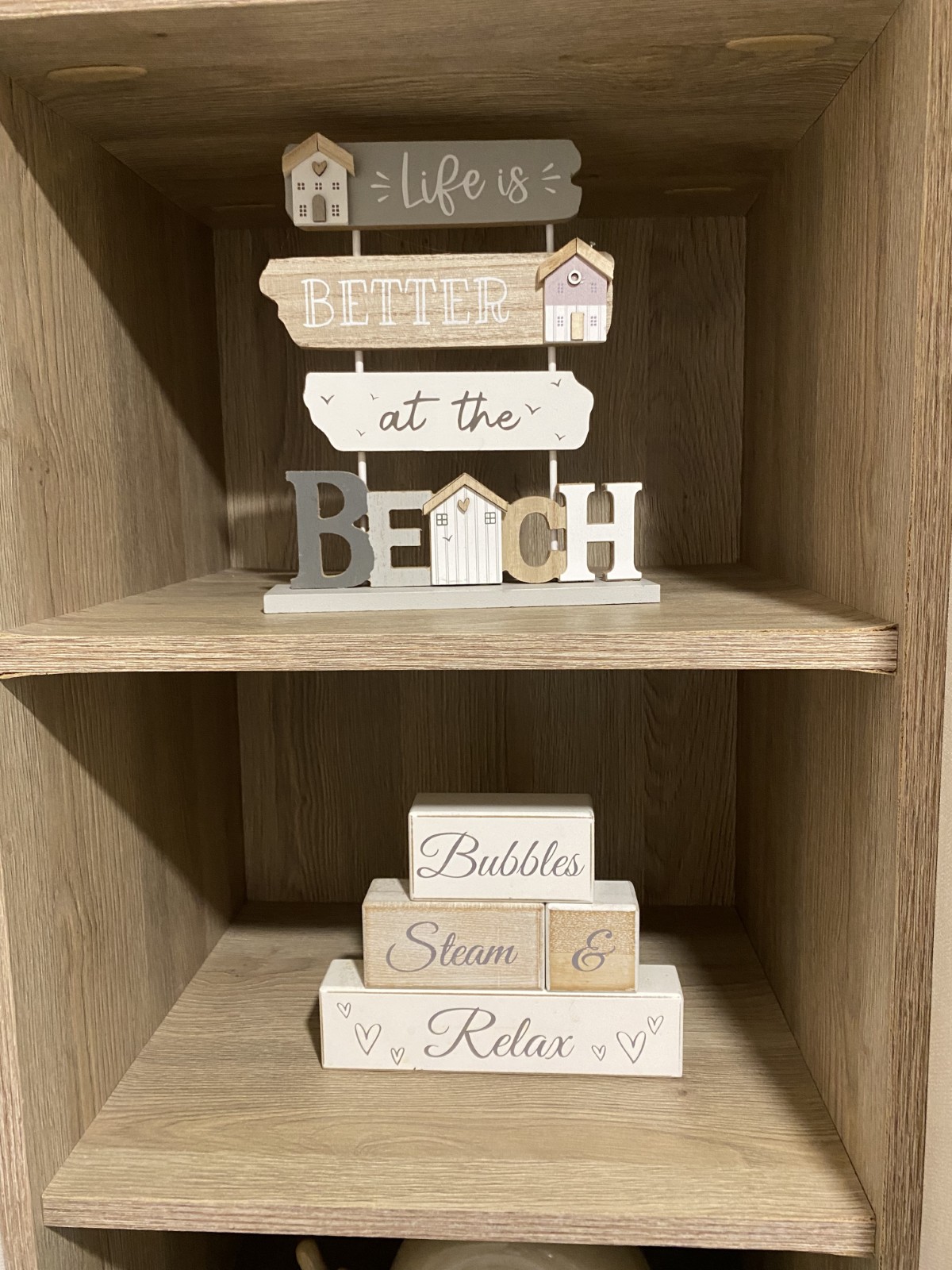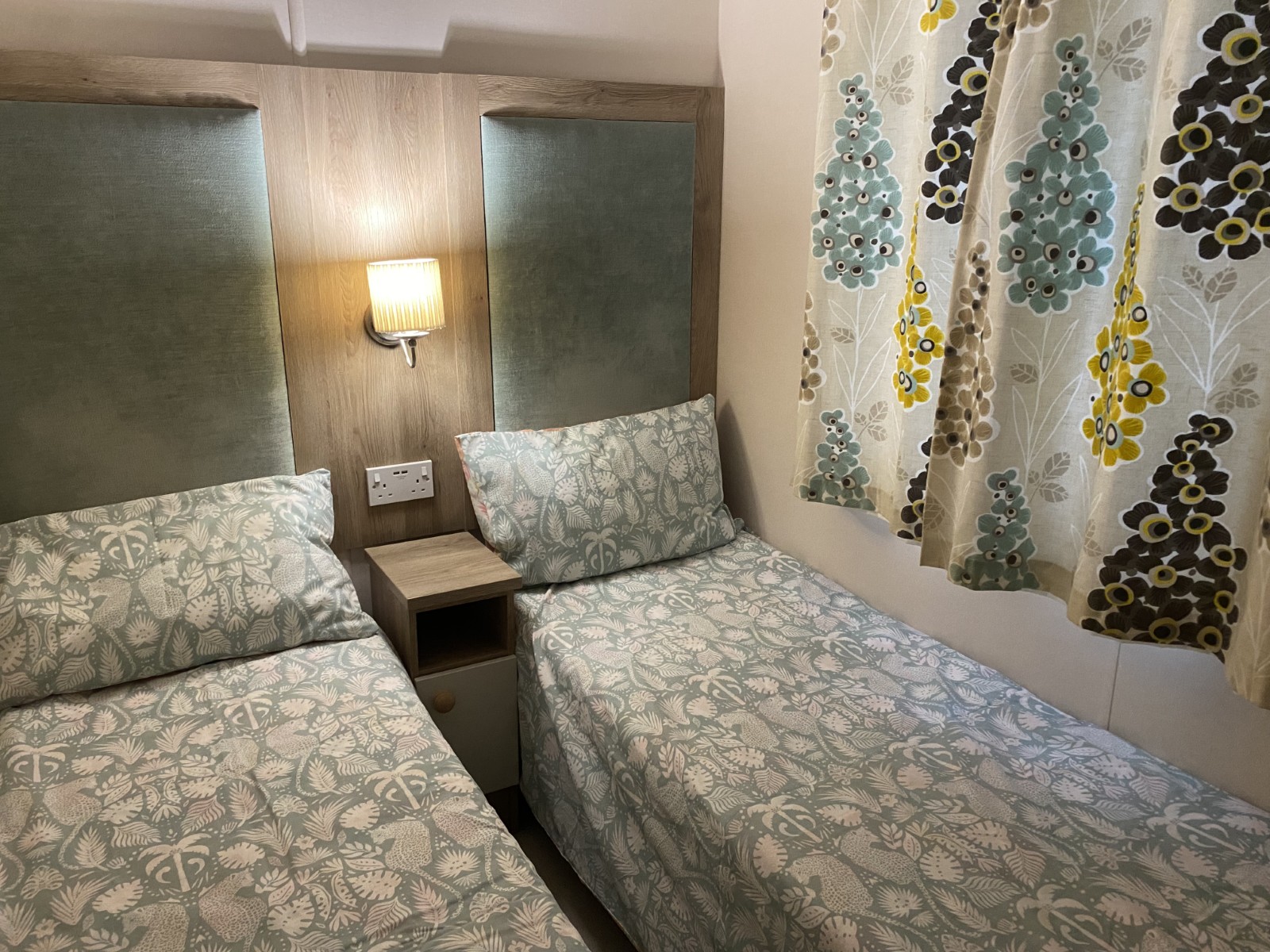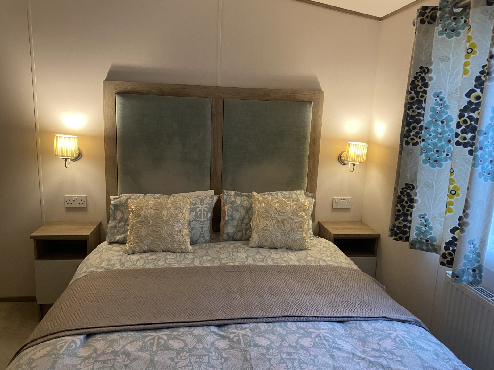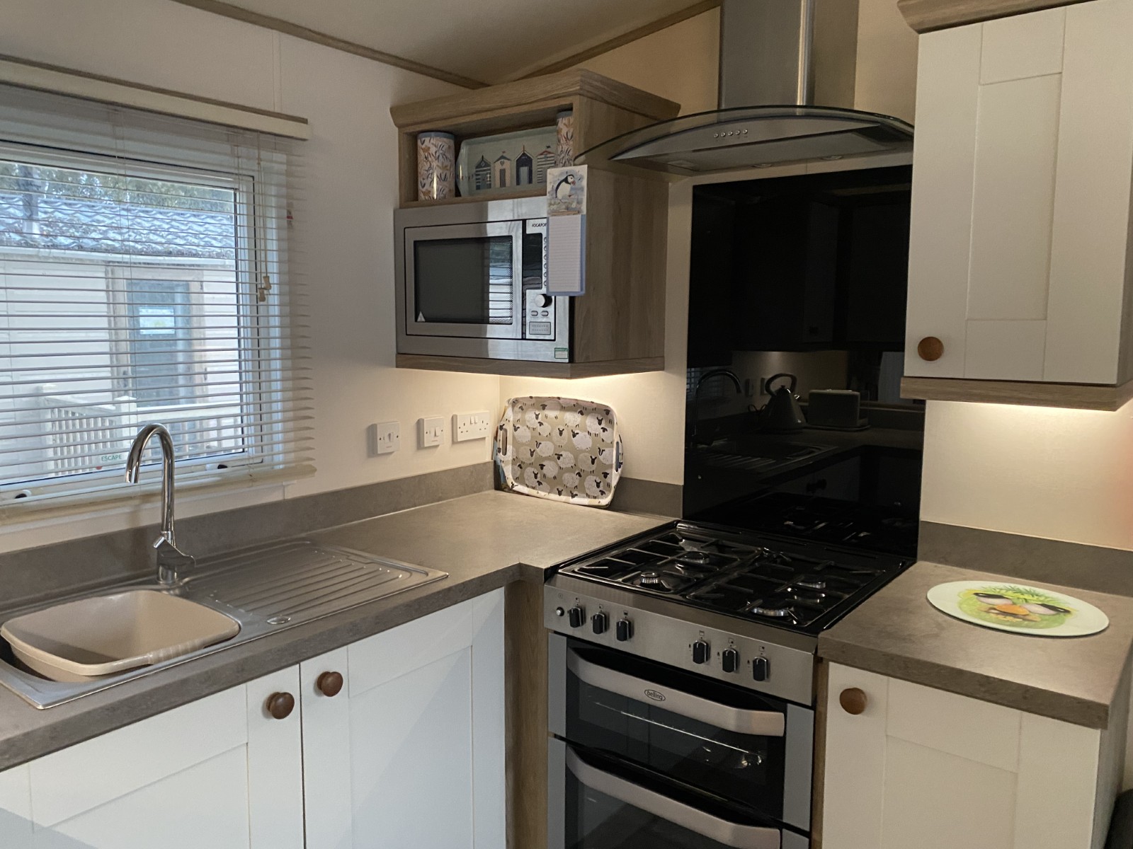 The cupboard next to the toilet houses the combi gas boiler which delivers hot water and heats the caravan when required. Toilet rolls, hand wash and toiletries are supplied in both bathrooms.